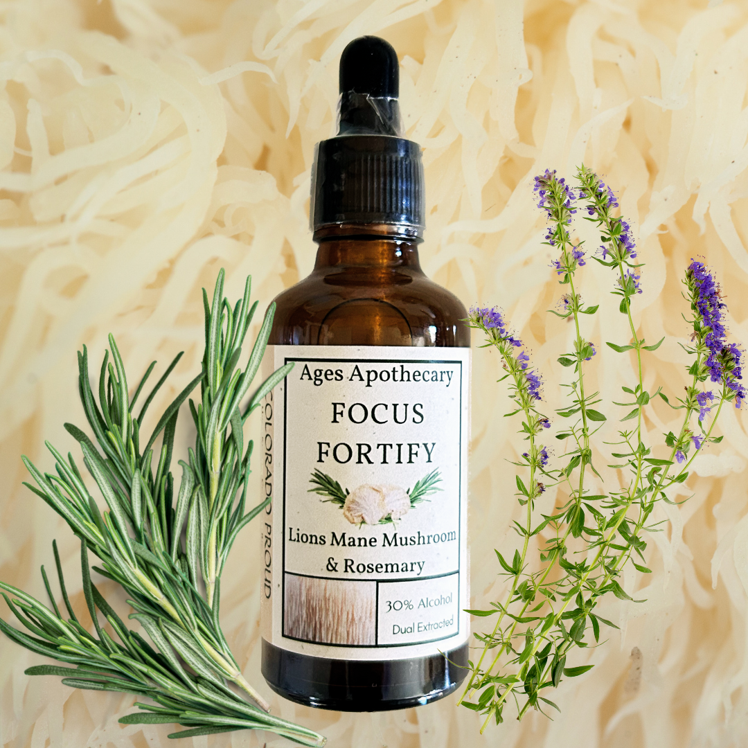 Ingredients: Homegrown Lions mane mushroom fruiting body, Fresh Rosemary, Fresh Homegrown Hyssop. Raw local Honey, Local Colorado Grain alcohol.